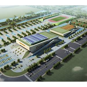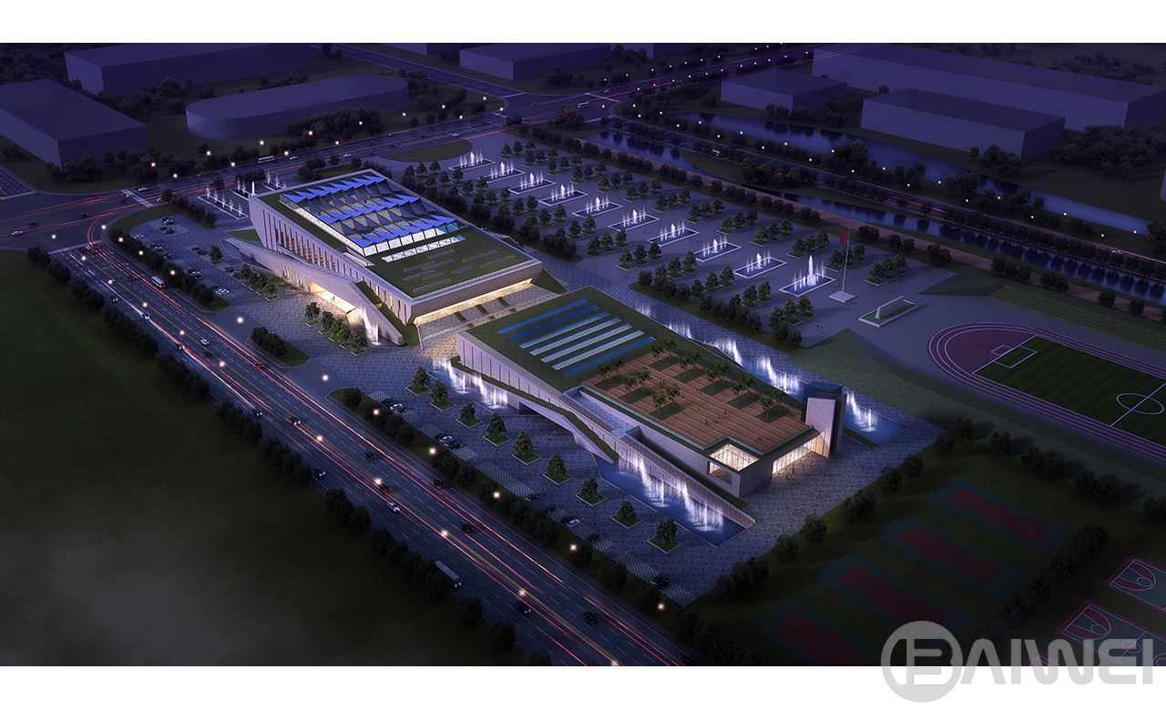 “靈石合出,福澤東萊”。本方案以:“靈石合出接祥瑞,全民健身福東萊”為設(shè)計(jì)主題,以彰顯萊州特色的山石文化。通過交匯而出的兩個(gè)石塊形成建筑基本體量,輔以流暢的線條和當(dāng)?shù)靥禺a(chǎn)的石材,打造出渾然天成又極具萊州特色的全民健身場(chǎng)所。建筑順應(yīng)地形,采用南北向矩形布局。同時(shí)根據(jù)用地周邊道路情況分別在場(chǎng)地南側(cè)的北苑路設(shè)置禮儀性人行主入口;東側(cè)的東嶺路設(shè)置機(jī)動(dòng)車出入口 ??紤]到體育場(chǎng)館使用上的特點(diǎn),地面停車的方式更為方便,停車場(chǎng)沿場(chǎng)館周邊分散式布置。平面功能以主體育館為中心,周邊配以輔助空間,其中觀眾、賽事組織、運(yùn)動(dòng)員、貴賓、辦公人員等均有其單獨(dú)的入口,以達(dá)到分區(qū)明確,流線清晰,互補(bǔ)干擾的設(shè)計(jì)目的。同時(shí)訓(xùn)練館與主體育館之間設(shè)置采光中庭,不但作為空間過度,豐富了內(nèi)部空間同時(shí)還解決了大進(jìn)深帶來的采光問題。