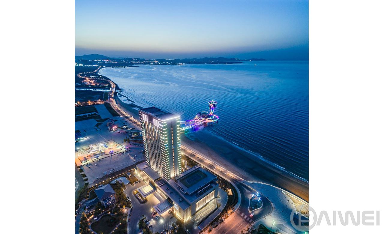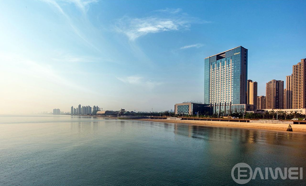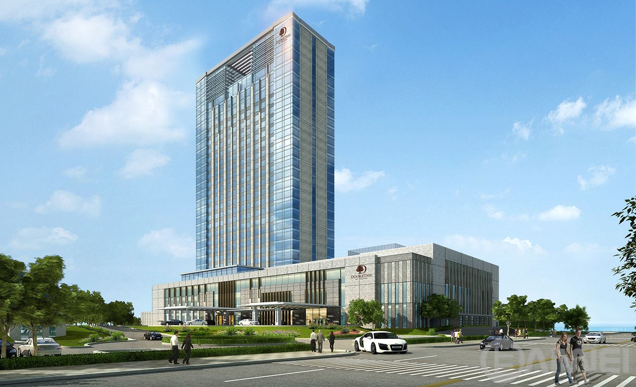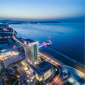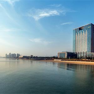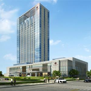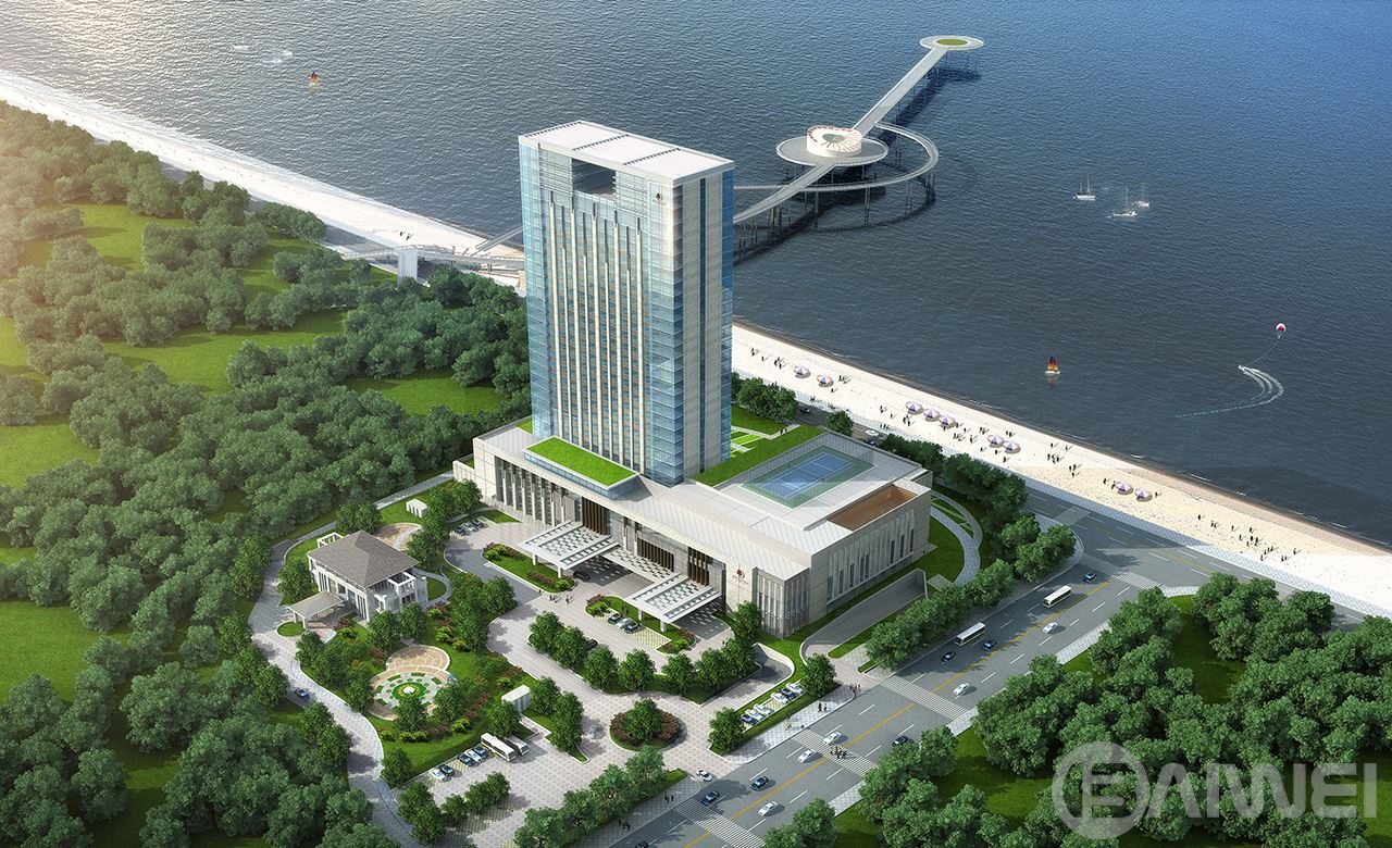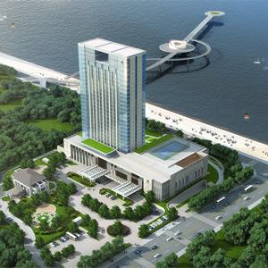 建筑地下一層、地上24層,由位于用地中央的酒店高層塔樓和南側(cè)及東側(cè)的4層裙房的宴會(huì)廳樓這兩部分組成。設(shè)計(jì)以“起點(diǎn)”----“入口”為出發(fā)點(diǎn),“入口”既有“大門”的意思,也意味著所有事物的起點(diǎn)和進(jìn)入口。酒店塔樓便是以“入口”為印象,塔樓兩側(cè)的幕墻部分的縱向線條和塔樓頂層中央部位的開口部分相得益彰,呈現(xiàn)出一個(gè)生機(jī)勃勃的“入口”。另外,裙房里面以及宴會(huì)廳樓外墻構(gòu)成也體現(xiàn)了“入口”這一概念。為客人營造出一種“歡迎光臨”的氛圍。從位于用地東側(cè)的寧波路可以進(jìn)入到酒店,在建筑南側(cè)設(shè)置了停車門廊。北側(cè)的花園可有效緩沖北風(fēng)的吹襲,南側(cè)花園設(shè)計(jì)成豐茂的綠地景觀。通過酒店塔樓與海岸線平行設(shè)置,使得靠海一側(cè)的客房可以欣賞到海景,靠陸地一側(cè)的客房可以欣賞到城市景觀。