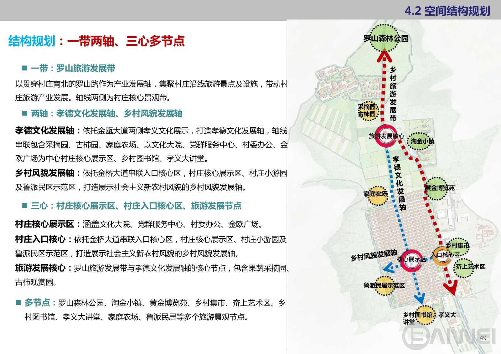 規(guī)劃形成“一帶兩軸、三心多節(jié)點(diǎn)”的空間結(jié)構(gòu)?!耙粠А绷_山旅游發(fā)展帶;“兩軸”孝德文化發(fā)展軸、鄉(xiāng)村風(fēng)貌發(fā)展軸;“三心”村莊核心展示區(qū)、村莊入口核心區(qū)、旅游發(fā)展節(jié)點(diǎn);“多節(jié)點(diǎn)”羅山森林公園、淘金小鎮(zhèn)、黃金博覽苑、鄉(xiāng)村集市、夼上藝術(shù)區(qū)、鄉(xiāng)村圖書(shū)館、孝義大講堂、家庭農(nóng)場(chǎng)、魯派民居等多個(gè)旅游景觀節(jié)點(diǎn)。