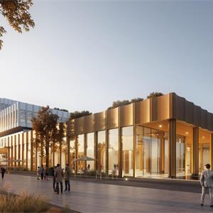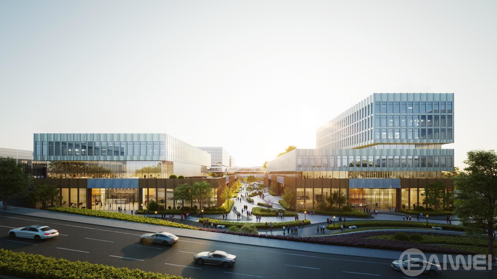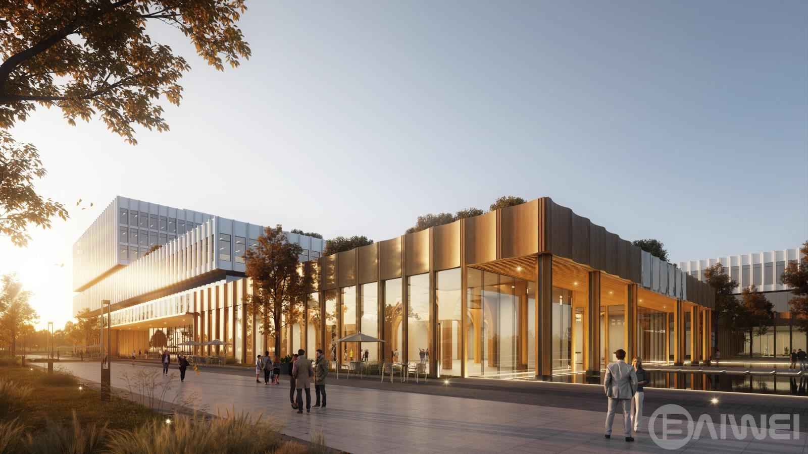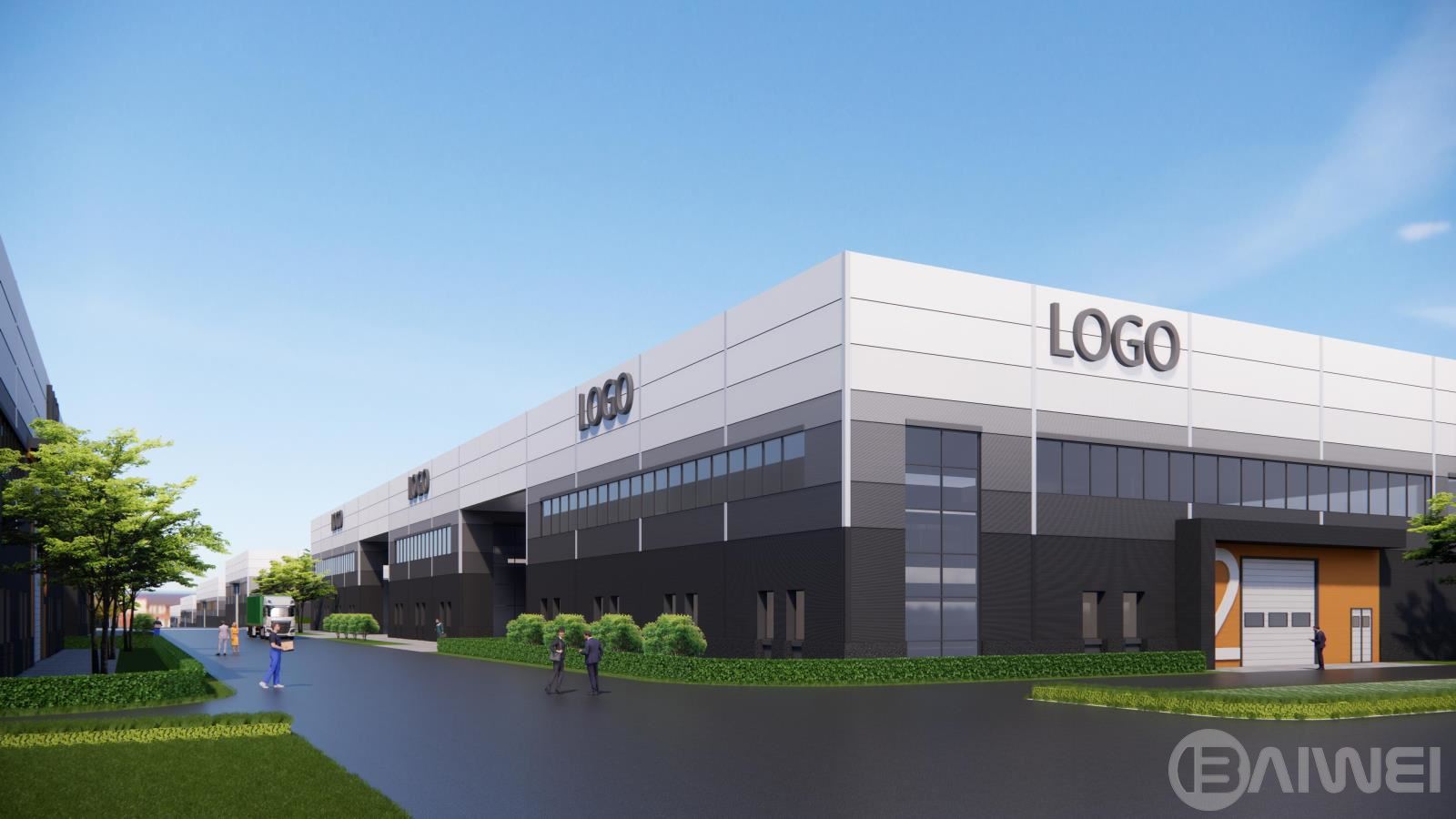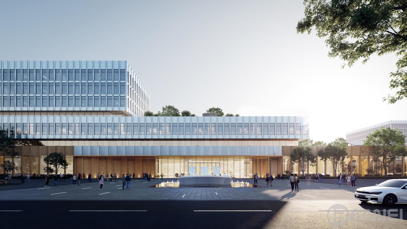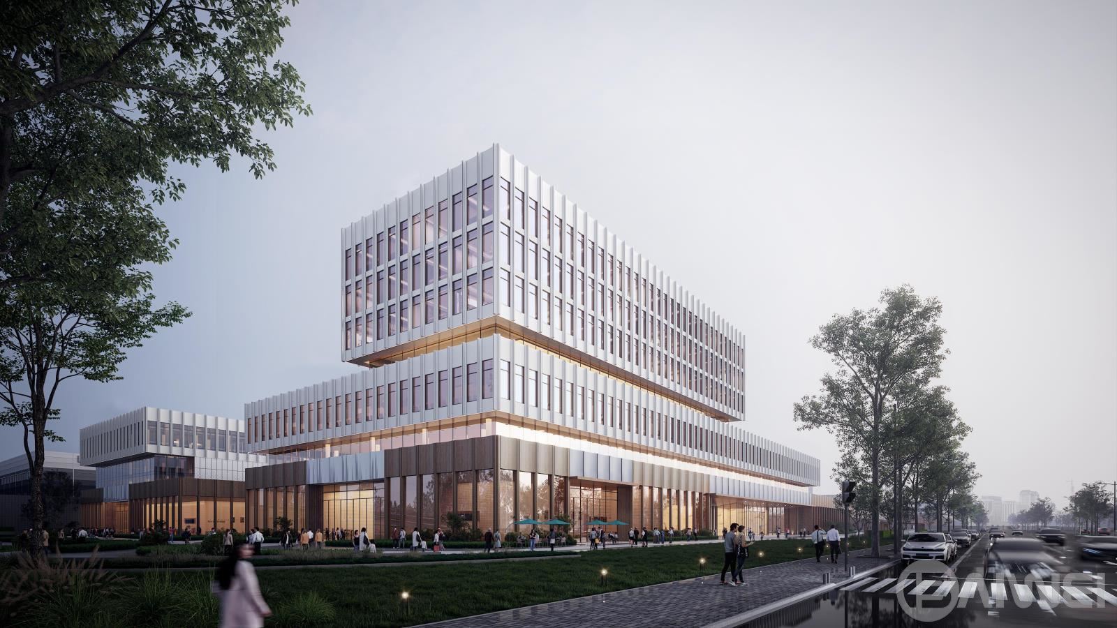 總體造型整體考慮,方案從海上平臺(tái)(藍(lán)鯨壹號(hào))汲取靈感,以模塊化的空間為基準(zhǔn),通過合理的柱網(wǎng)規(guī)劃,方正靈活配置功能空間,打造高適應(yīng)性產(chǎn)品,實(shí)現(xiàn)多重使用模式的靈活切換。立面設(shè)計(jì)手法簡潔利落,普通窗墻體系設(shè)計(jì),控制造價(jià),形成簡潔大氣、體量感明顯的建筑形象,同時(shí)又不失細(xì)節(jié)?!翱萍紕?chuàng)新”與“綠色生態(tài)”相結(jié)合的零碳設(shè)計(jì)是本項(xiàng)目的亮點(diǎn),結(jié)合展廳,跌落的屋頂平臺(tái)成為辦公場所的二次延伸,同時(shí)屋頂亦可有效調(diào)節(jié)微氣候,降低頂層室內(nèi)空間氣溫調(diào)節(jié)的能耗,為園區(qū)提供生態(tài)和諧的辦公研發(fā)環(huán)境。廠房亦延續(xù)海工平臺(tái)理念,廠區(qū)立面采用從深至淺,從海洋到天空。結(jié)合不同金屬板顏色,做出細(xì)節(jié)變化,控制造價(jià)的同時(shí),又形成簡潔現(xiàn)代的廠房形象。